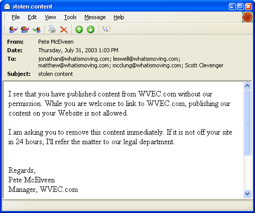 The really amusing thing is that the whole email ends with "Regards," like we're old friends. How does someone decide what to write in a situation like that? We wonder how many different closings he tried before settling on "Regards." "Love, Pete McElveen"? "Yours truly"? "Regretfully"? "We're-a-local-news-outlet-but-we-act-like-corporate-jerks-from-ABC"? What an incredibly absurd letter to send a garage-band filmmaking operation like ours. Of course, being the nice people we are, we complied. But only to set an example for the kids.